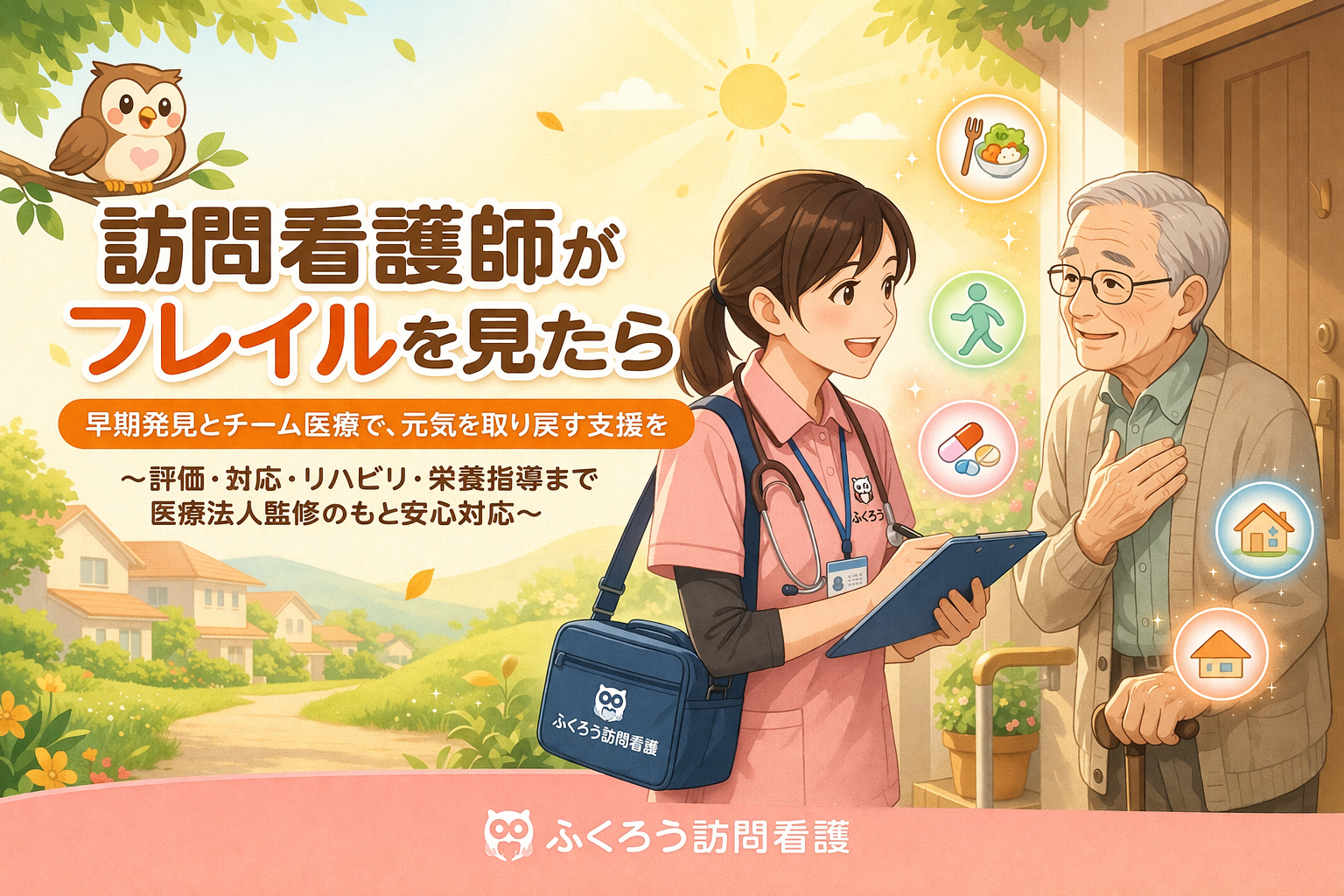 フレイルは加齢による可逆的な脆弱状態であり、身体・精神・社会的な要素が複合して発症します。日本版フレイル基準(J‑CHS)に基づく定量的な評価と、栄養・運動・薬物療法・環境整備など多面的な介入によって、状態の改善や要介護状態への進行予防が期待できます。訪問看護師は利用者の生活環境の中で小さな変化に気づき、早期発見と迅速な支援を行う役割を担っています。医療法人の監修を受けるふくろう訪問看護では、専門職が連携しながら科学的根拠に基づくケアを提供し、ご家族とともに健康寿命の延伸を目指します。