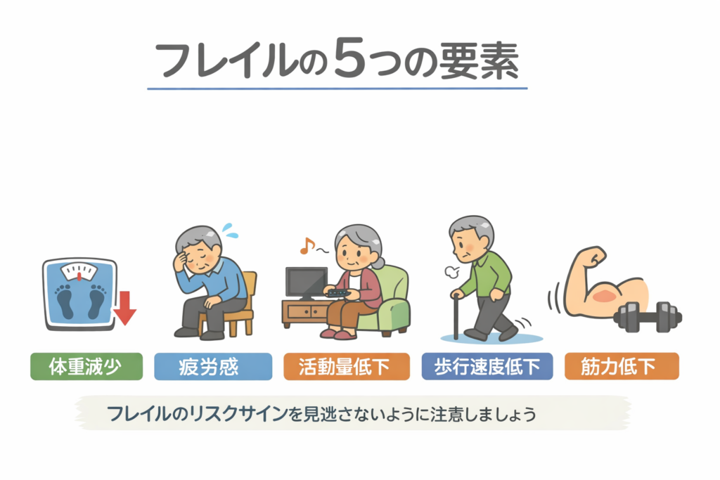5項目のうち3つ以上に当てはまる場合はフレイル、1〜2項目ならプレフレイル、いずれも該当しない場合は健常とされます。